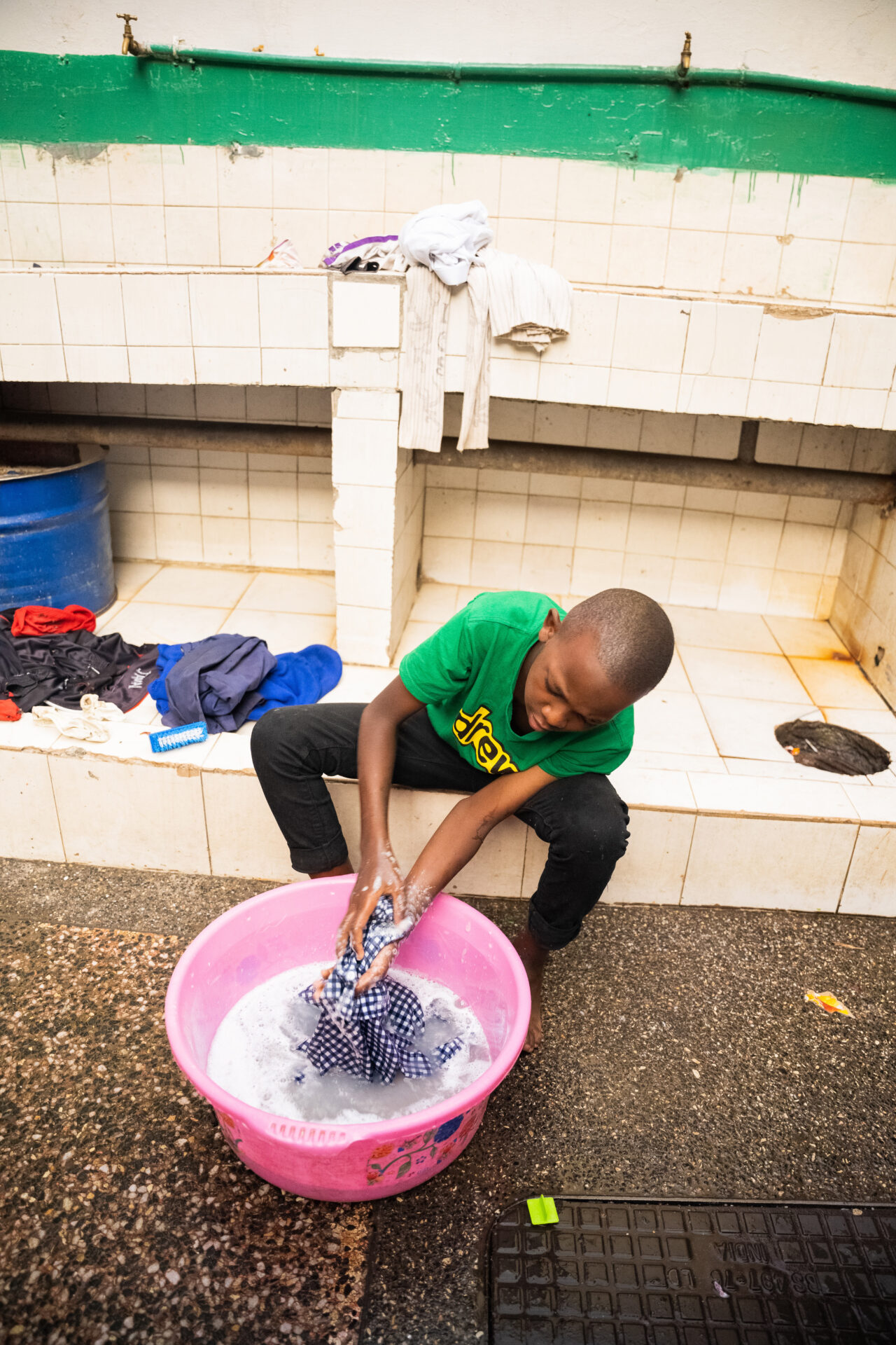 La machine à laver de l’orphelinat est hors service depuis plusieurs mois. En attendant de pouvoir la remplacer, les lessives sont faites à la main, dans des bassines.